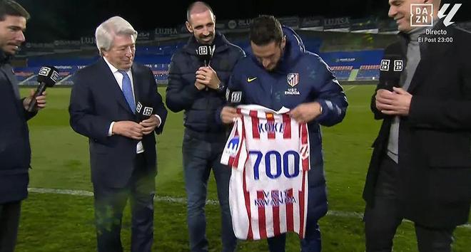 客场与赫塔费的比赛,马竞队长科克迎来了他在俱乐部的第700场里程碑,也由此成为队史第一个达成此成就的球员。赛后,科克从俱乐部主席塞雷佐手中接过700场纪念球衣,并接受了DAZN的采访。