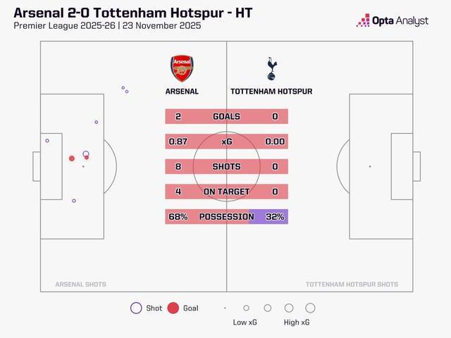 此役客场对阵阿森纳,热刺在上半场没有完成一脚有效射门,而阿森纳则尝试了8次射门,4次射正,其中2次转化为进球。